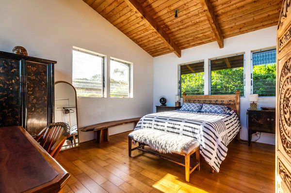 Set on three private lush acres designed to feel like a botanical garden, Kūaloli’s layout reflects its unique spirit. The expansive 3,600-square-foot Main House sits at the back of the property, with soaring three-story ceilings that inspire spaciousness and awe and floor-to-ceiling windows that bring the outdoors in. The Main House is a spacious . loft-style home that comfortably sleeps six, blending community with solitude.